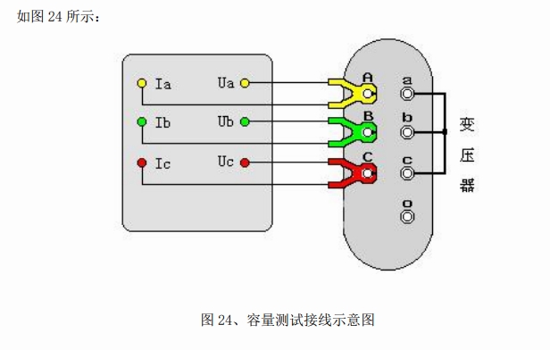 容量測試儀配有三把測試鉗(黃、綠、紅),每只鉗子分別引出兩根測試線,一根粗線、一根細(xì)線,粗線接到儀器面板上容量測試端子對應(yīng)顏色的電流端子(Ia、Ib、Ic),細(xì)線接到儀器面板上容量測試端子對應(yīng)顏色的電壓端子(Ua、Ub、Uc),將鉗頭按顏色分別夾在被試變壓器的高壓側(cè)各相接線柱上,變壓器的低壓側(cè)要用專用短接線良好短接。
